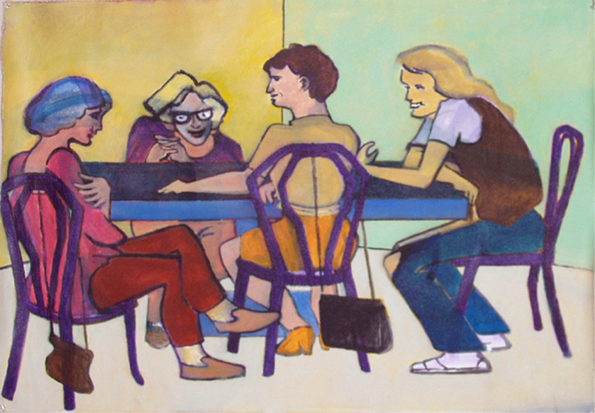 I know I still have a napkin sketch from the burrito shoppe where I watched these four friends during my half hour lunch break one afternoon. I spent a lot of time on the idea of purse straps looped over the backs of chairs, but the real kick was in the people that emerged when I began the painting months later. I'm not sure where these personalities came from—the slight attention I had been paying them was no more than the irritated envy of my stressed out mood, but I'm glad they graced me.