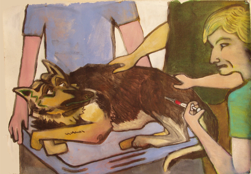 This image is of our beloved dog Jackie's last moments. A moment so poignant I couldn't keep from painting it and still have a hard time showing it to anyone. I think it's revealing that in starting to work on this emotion-charged scene I began with a scribble to develop Jackie's body. I usually work with a contour drawing approach and I have a lot of confidence in my line, but I was on unsure ground with this one.