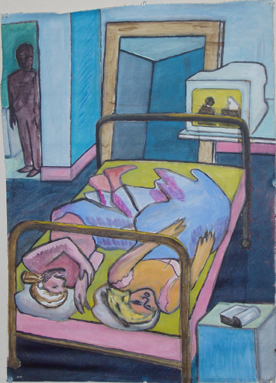 In a trip to New York we saw a retrospective of Hans Richter at the Guggenheim Museum and among the deconstructivist tricks he employed in his tedious career was painting things upside down. This creates a twinning difficulty both in representing and in decoding the visual image. So I think that was a pretty direct influence on the crazy angle I depict this scene from. The fairly obvious permutation is the question "What if the subject being painted is already upside down?" An interesting aspect also is the way my modern vocabulary mixes upside down and diminished (basically photographic) foreshortening of the figures.