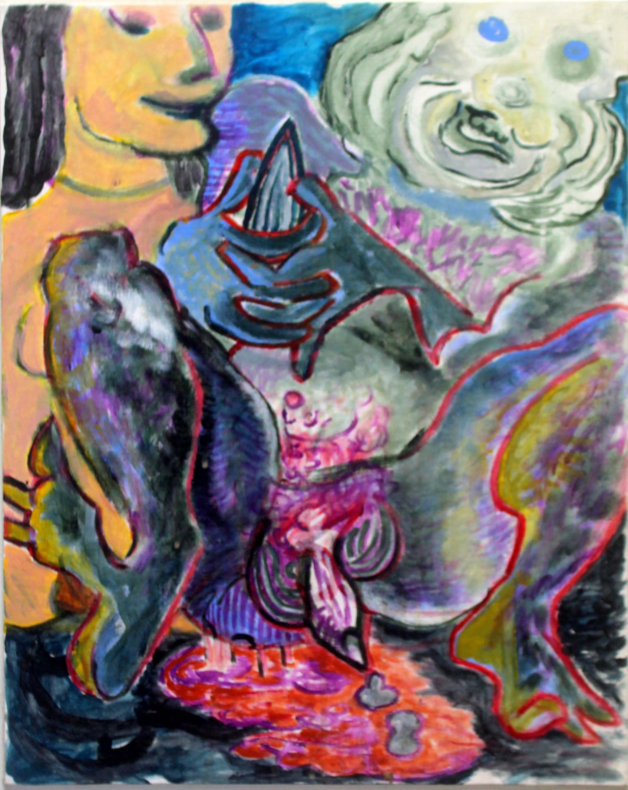 Now the naked belly of the giant began to swell and churn from the efforts of the young deerherders within--now it distended as they arched and prodded the inner linings with feet and heads and elbow--now the giant groaned and pressed his four fingered hands to contain this inner enemy. A bump appeared, poked between the fingers and Sateen gasped in misery as yellow bile burst away from the point of a sharpened knife, the very knife which Anika and her mother had baked whole within the wedding cake that morning.